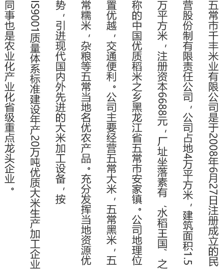 五常市千豐米業(yè)有限公司是于2008年6月27日注冊(cè)成立的民營股份制有限責(zé)任公司 ,公司占地面積40000平方米,建筑面積15000平方米,注冊(cè)資本6688萬元,廠址坐落于素有“水稻王國”之稱的黑龍江省優(yōu)質(zhì)稻米之鄉(xiāng)黑龍江省五常市安家鎮(zhèn),地理位置優(yōu)越,交通便利。 公司主要經(jīng)營五常大米、五常黑米、五常糯米、五常粥米,雜糧等五常當(dāng)?shù)孛麅?yōu)農(nóng)產(chǎn)品,充分發(fā)揮當(dāng)?shù)刭Y源優(yōu)勢,引進(jìn)現(xiàn)代國內(nèi)外先進(jìn)的大米加工設(shè)備,按ISO9001質(zhì)量體系標(biāo)準(zhǔn)建設(shè)年產(chǎn)20萬噸優(yōu)質(zhì)大米生產(chǎn)加工企業(yè),同時(shí)也是黑龍江省農(nóng)業(yè)產(chǎn)業(yè)化省級(jí)重點(diǎn)龍頭企業(yè)。 公司擁有設(shè)備技術(shù)一流的稻米品種研發(fā)機(jī)構(gòu),在五常市志廣鄉(xiāng)、龍鳳山鄉(xiāng)和安家鎮(zhèn)一帶擁有38萬畝有機(jī)、綠色生態(tài)水稻種植基地,其中有機(jī)水稻種植面積21390畝,良好農(nóng)業(yè)認(rèn)證種植面積17260畝,綠色水稻基地33萬畝,大米年產(chǎn)量約20萬噸,銷售網(wǎng)絡(luò)覆蓋全國二十余個(gè)省、市、自治區(qū)。